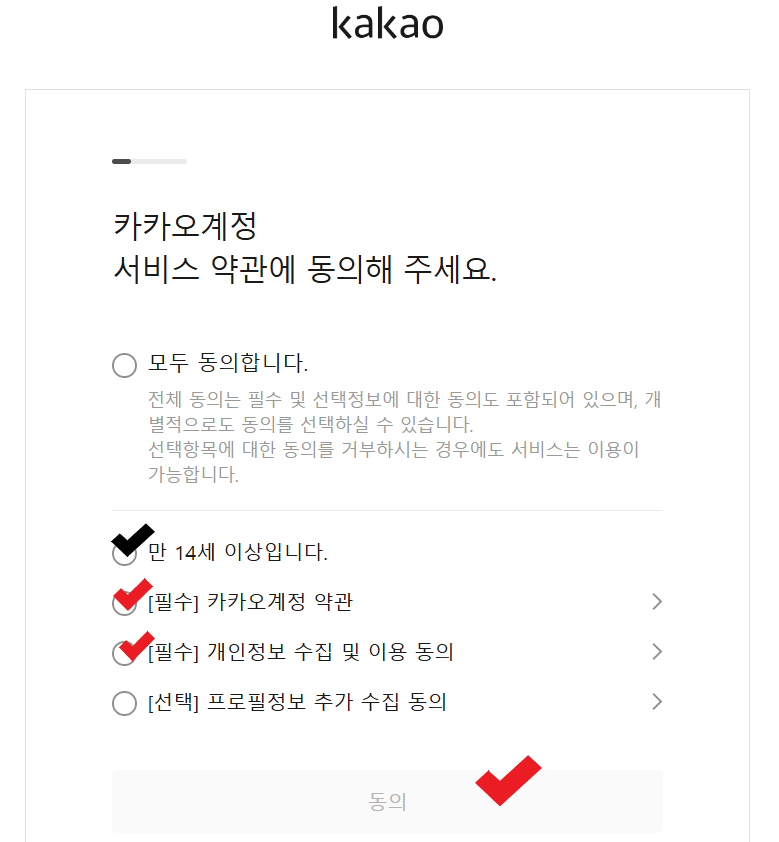 필수 항목만 체크합니다. 그러면 동의라고 쓰여있는 버튼이 노란색으로 바뀌고 그걸 클릭!!